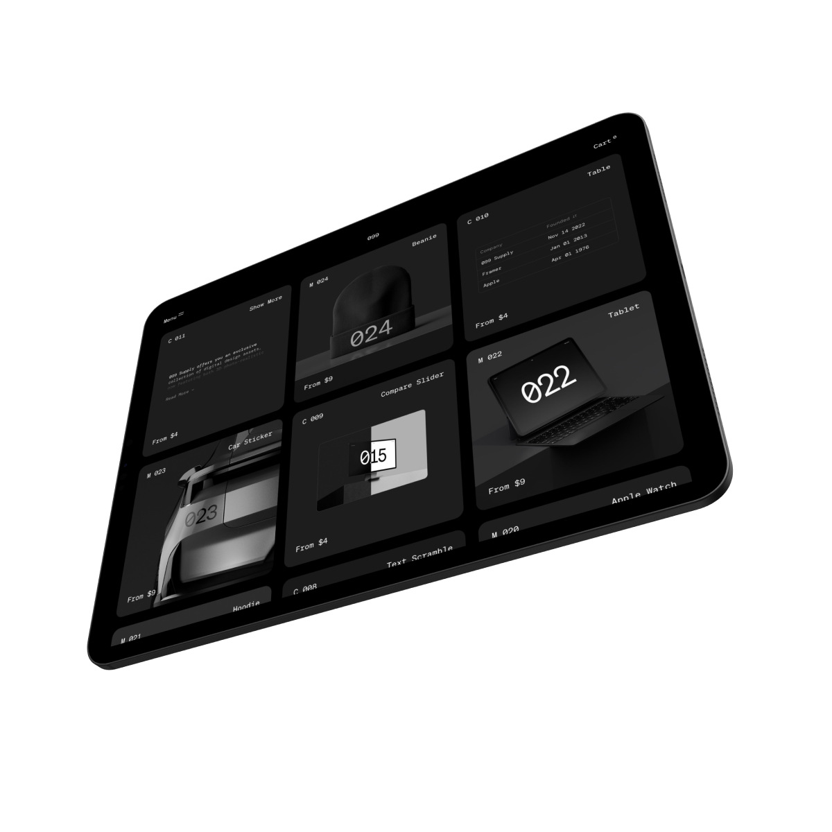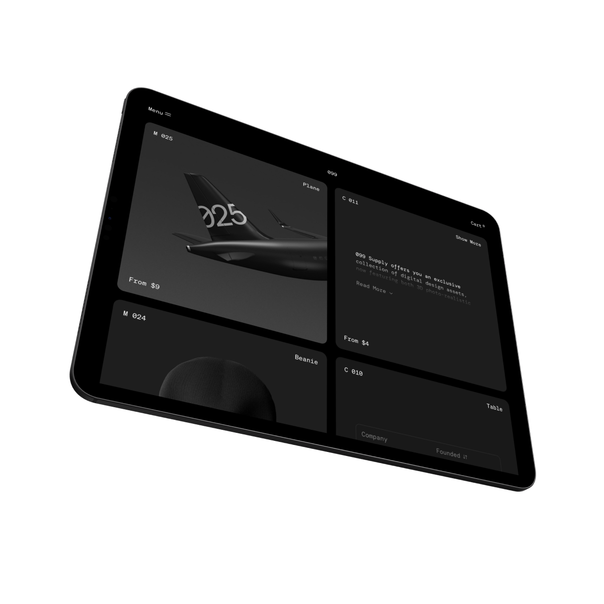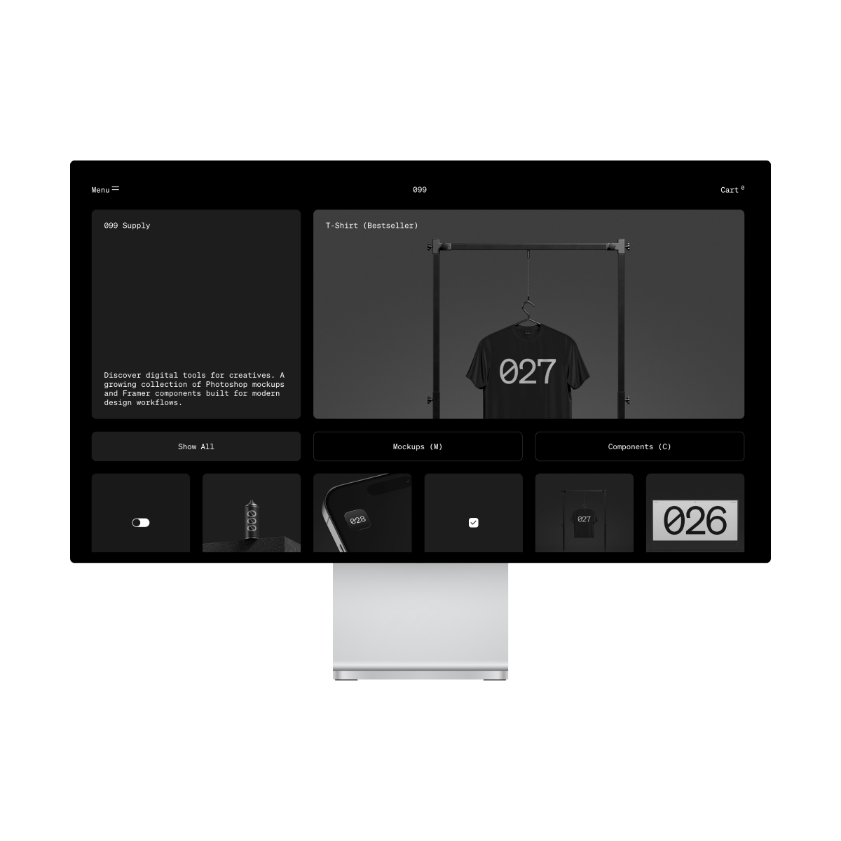 099 Supply is a studio with a strong Swiss design influence that builds digital tools for creators. We began with a catalogue of photorealistic product mockups made for Photoshop. We're now building a new product range in parallel; modular web components for no-code website building platform, Framer.