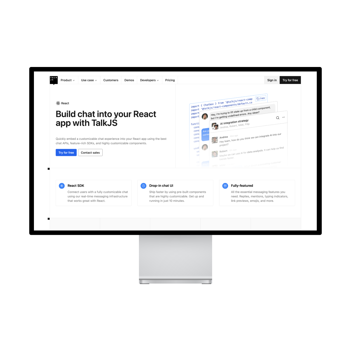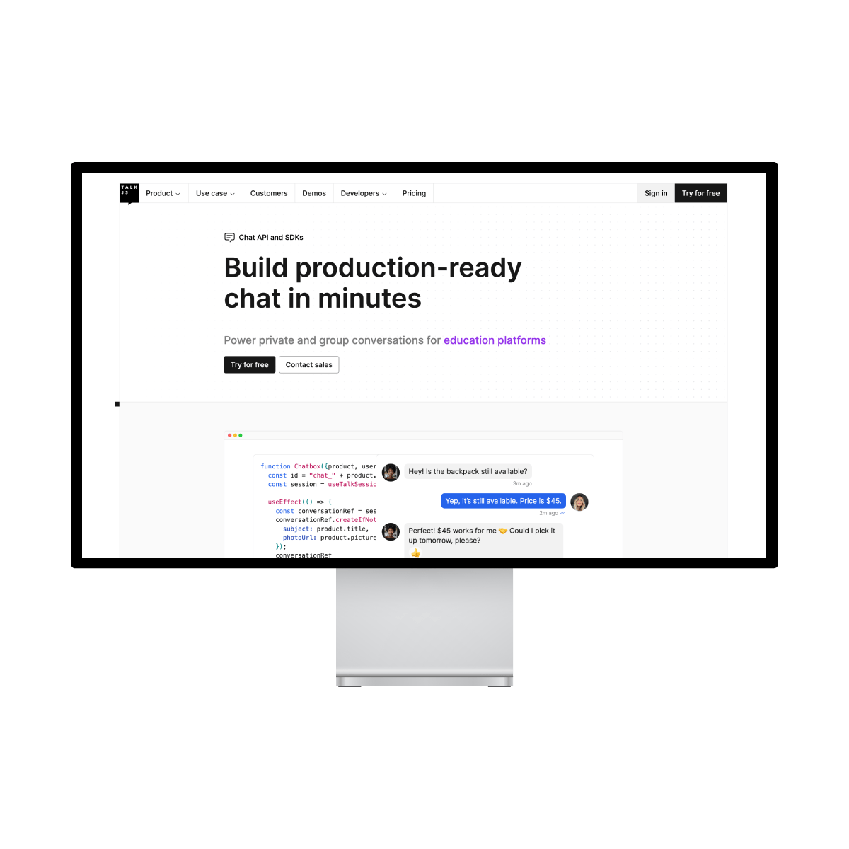 TalkJS is a fully-distributed company dedicated to building a chat API that helps people ship a chat feature in their app or website in minutes. Customers receive a complete suite of embeddable UIs and flexible APIs that work seamlessly in any chat or messaging use case.